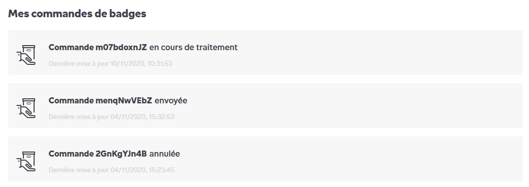 Dans la 3ème section, Mes commandes de badges, vous pouvez voir le statut de votre commande et la date de dernière mise à jour