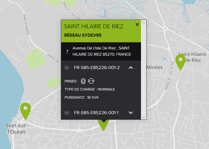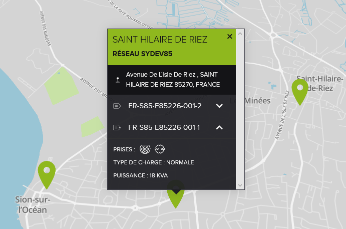 Par exemple en sélectionnant une borne normale sur la carte des bornes, on observe que le point de charge 1 dispose des connecteurs T2 et domestique (image 1) et que le point de charge 2 dispose des connecteurs T3 et domestique (image 2).