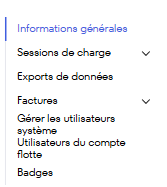 Les onglets sur le côté de la page vous permettent de trouver les sessions de charge, les badges de votre collectivité ou les factures.