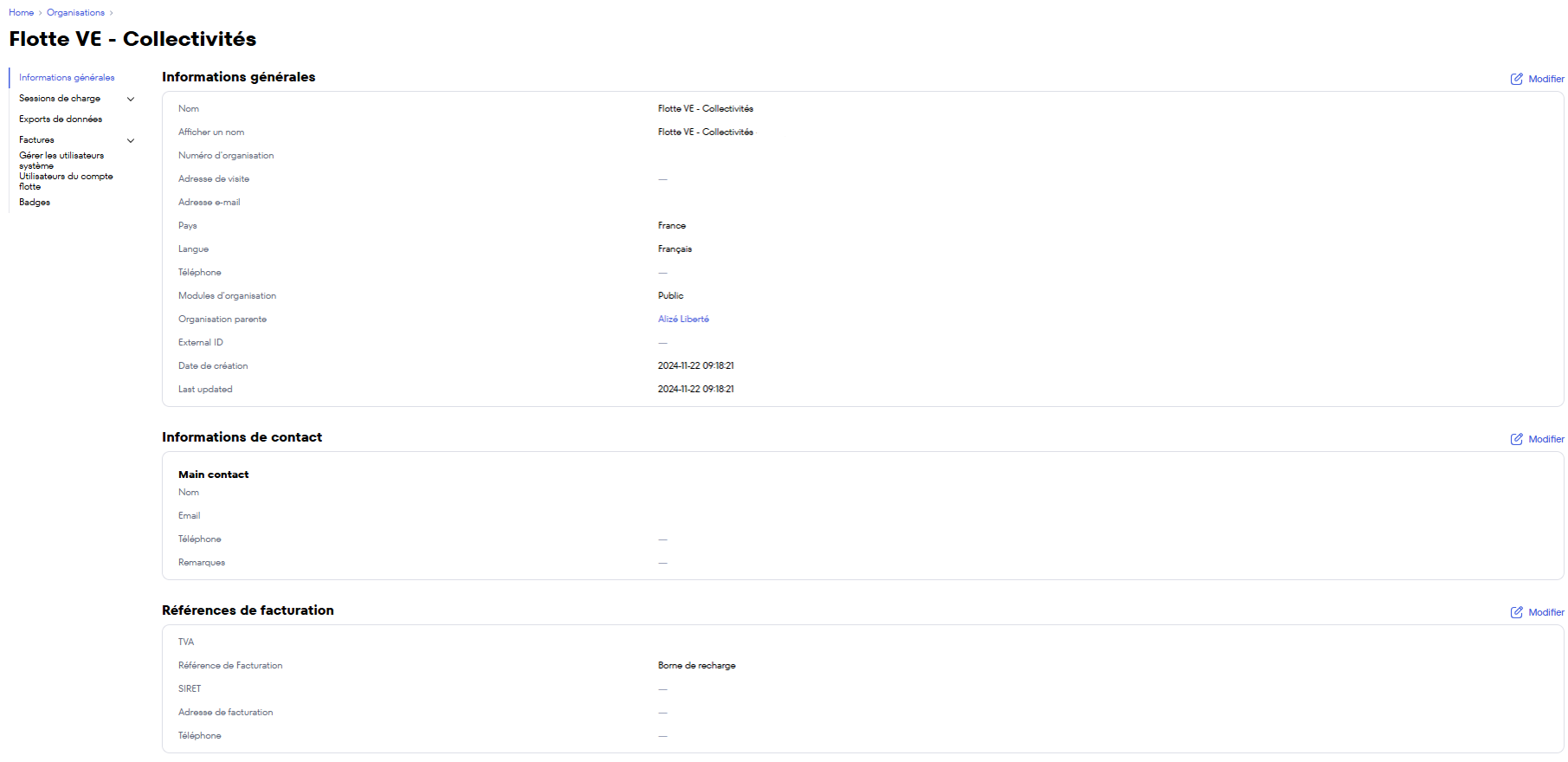 Flotte virement : Une fois toutes ces informations complétées, nous ferons la création de la flotte sur la supervision, sous cette flotte nous créerons un accès pour un gestionnaire de flotte qui pourra suivre les charges, les factures et gérer les badges pouvant se charger.